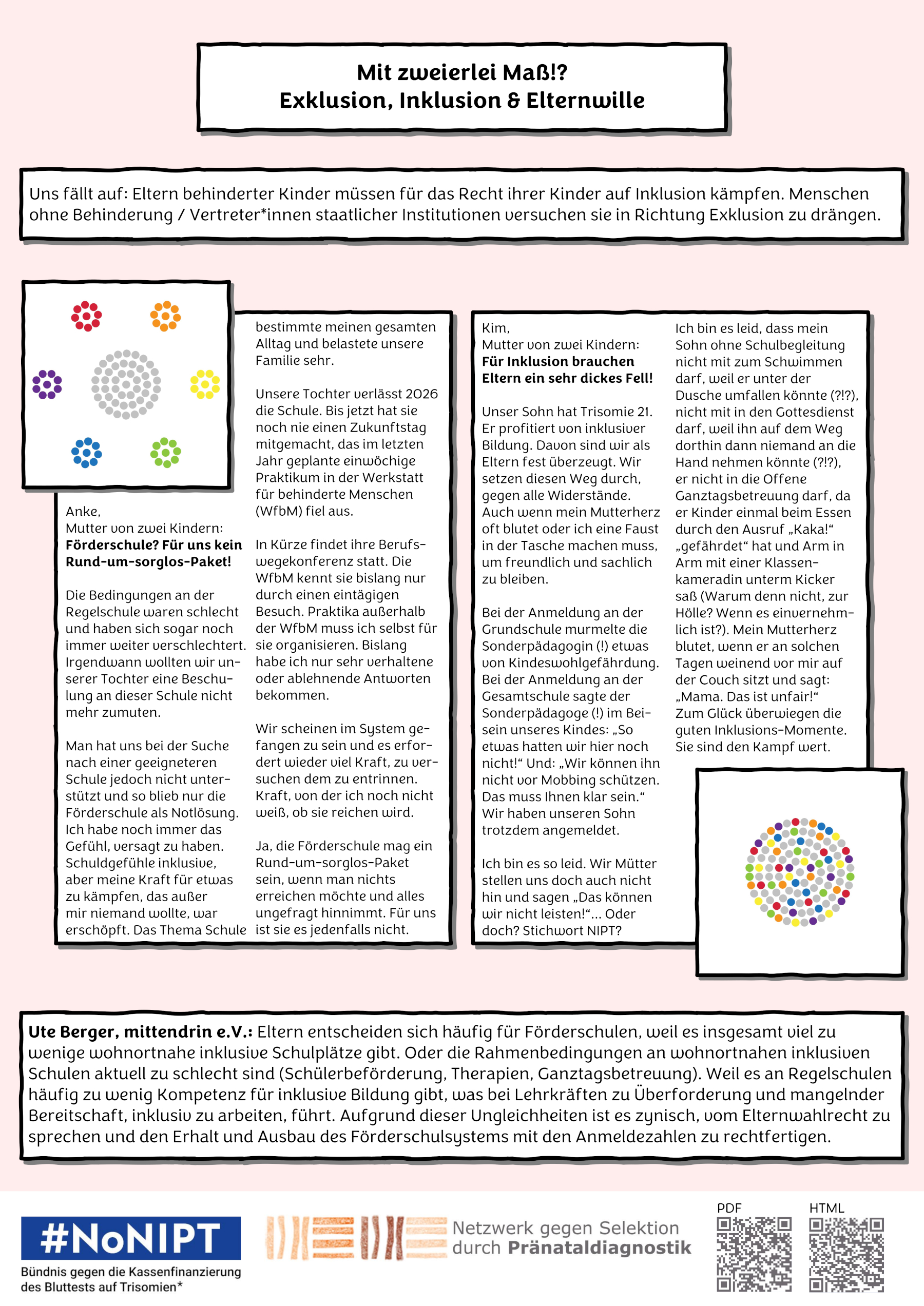 Uns fällt auf: Eltern behinderter Kinder müssen für das Recht ihrer Kinder auf Inklusion kämpfen. Menschen ohne Behinderung / Vertreter*innen staatlicher Institutionen versuchen sie in Richtung Exklusion zu drängen.