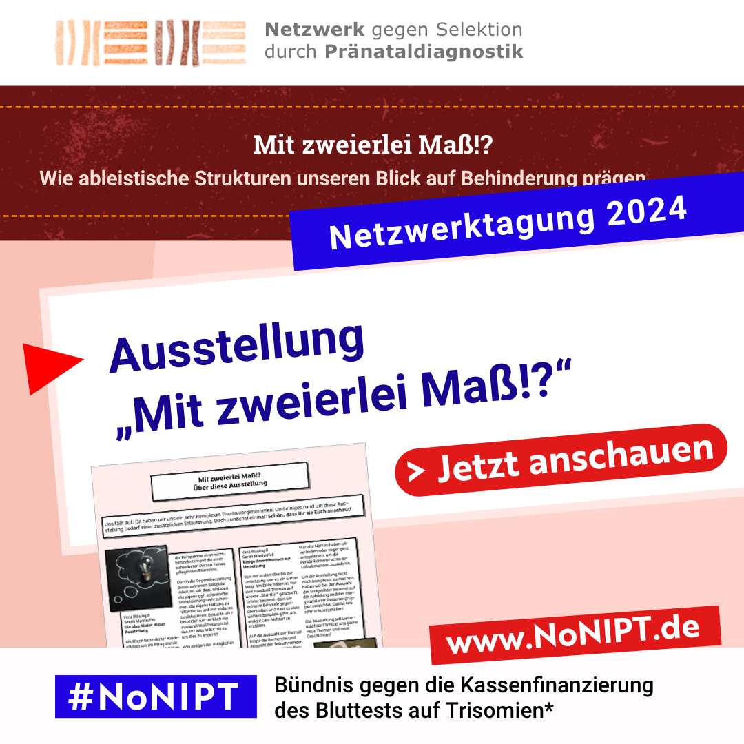Die Ausstellung hat daher aus gutem Grund den Titel der Netzwerktagung 2024 aufgenommen: „Mit zweierlei Maß?!“ Sie fordert zum Nachdenken über eine Gesellschaft auf, die individuelle Entscheidungen von Menschen sehr unterschiedlich bewertet, sie fördert oder abwehrt, je nachdem, ob die Menschen eine Behinderung haben oder nicht.