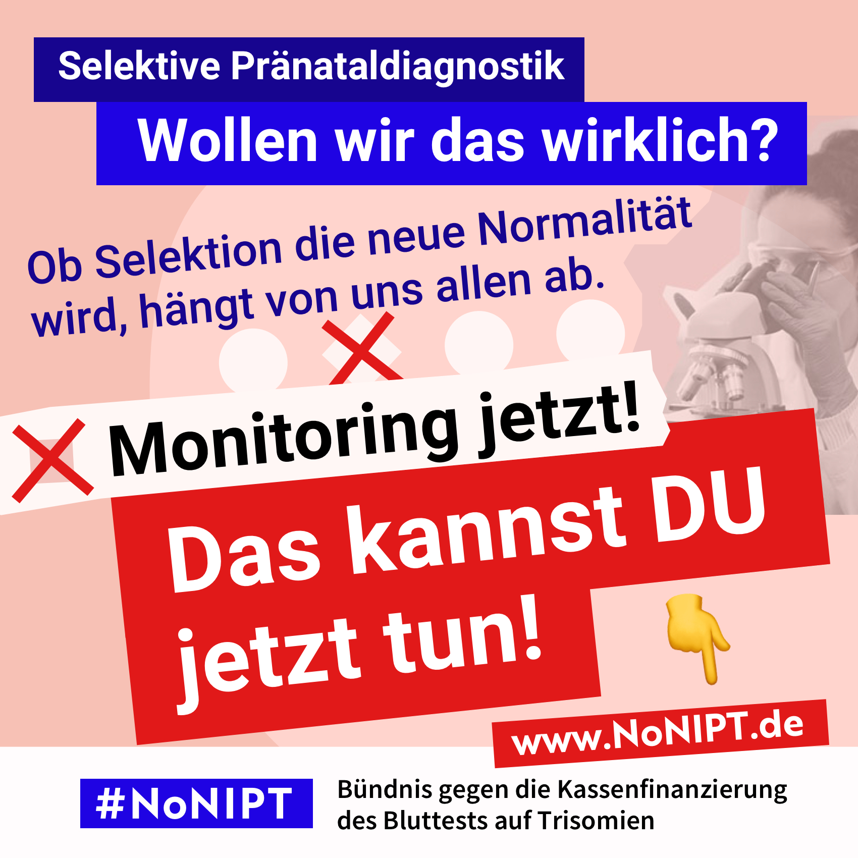 Das darf nicht wieder passieren! Unter dem Motto „Monitoring jetzt!“ starten wir einen neuen Anlauf. Wir fordern eine unabhängige und systematische Auswertung der gesellschaftlichen Folgen des NIPT und einen Überblick über die Gründe, warum Menschen diesen Test durchführen lassen. Das sogenannte Monitoring soll sichtbar machen, was viele bereits spüren: Mit der Kassenzulassung hat